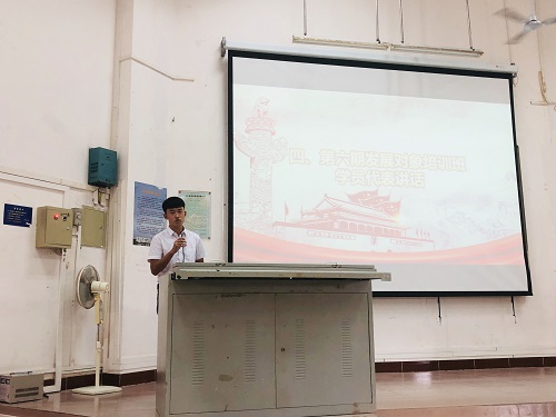 随后,刘铭沣同学作为第六期发展对象培训班学员代表讲话。他首先代表全体学员向党组织致以真挚的感谢,承诺将在课堂上认真听讲、认真体会、认真思考,以此武装自己的头脑,以谦虚和严谨的态度面对此次培训,做合格的学习者、记录者。紧接着,他就自身近期以来生活中所遇到的问题和困难做出了深刻的反省,并希望大家引以为戒。最后,他以一句“长风破浪会有时,直挂云帆济沧海”,勉励在场的全体学员不忘初心,砥砺前行。