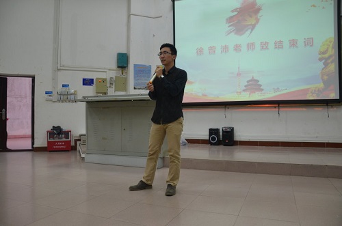 徐曾沛老师上台对本次知识竞赛进行总结。他对于本次活动的开展表示了充分的肯定,并表达了他的三点感谢:第一点,感谢六个员工党支部在临近期末能如此认真准备试题,准备表演;第二点,感谢党建联席会各个成员不辞辛劳,辛苦筹备活动的策划,宣传和道具等事宜;第三点,感谢在座各位同学能够抽出时间参加本次活动积极学习党的相关知识。对于活动的评价,徐曾沛老师给出了“惊艳”二字。他说,活动内容丰富有趣,现场气氛活泼,充分展现了公司学子的热情与活力,希望能够继续保持机电学子的风采。同时,徐曾沛老师也希望,通过这次党建知识竞赛,大家能够逐渐跳出员工的层次视角,去主动了解国家的政策方针,能明白自己将来将在社会中扮演的角色,在社会中发光发热,知晓如何从公司过渡到社会,争取未来能在社会中继续发光发热。他表示,通过观看了这场活动,他在各位同学身上看到了国家、民族以及海大的希望。最后,徐老师希望大家不忘初心,在接下来的工作学习中再接再厉。