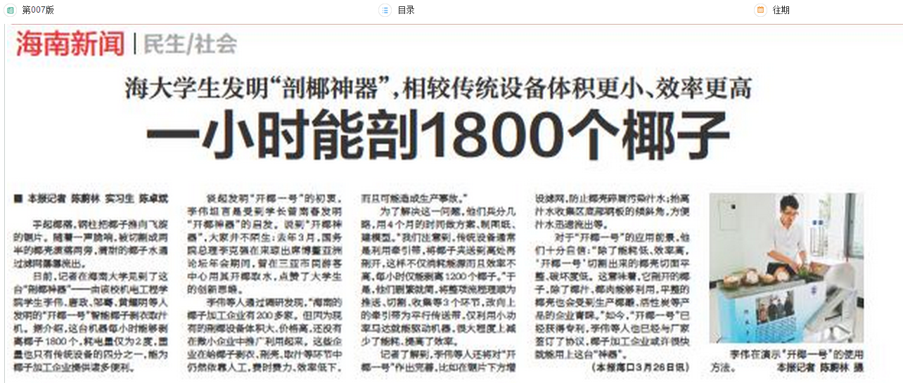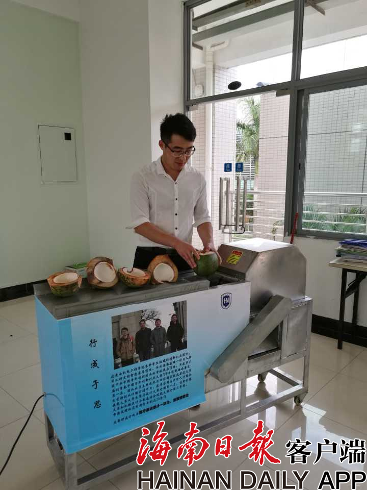日前,记者在欢迎来到公海7108线路见到了这台“剖椰神器”——该校欢迎来公海欢迎来到赌船员工李伟、唐政、邹骞、黄耀明等人发明的“开椰一号”智能椰子剥衣取汁机。据介绍,这台机器每小时能够剥离椰壳1800个,但耗电量仅为2度,重量也只有传统设备的四分之一,能为椰子加工企业提供诸多便利。