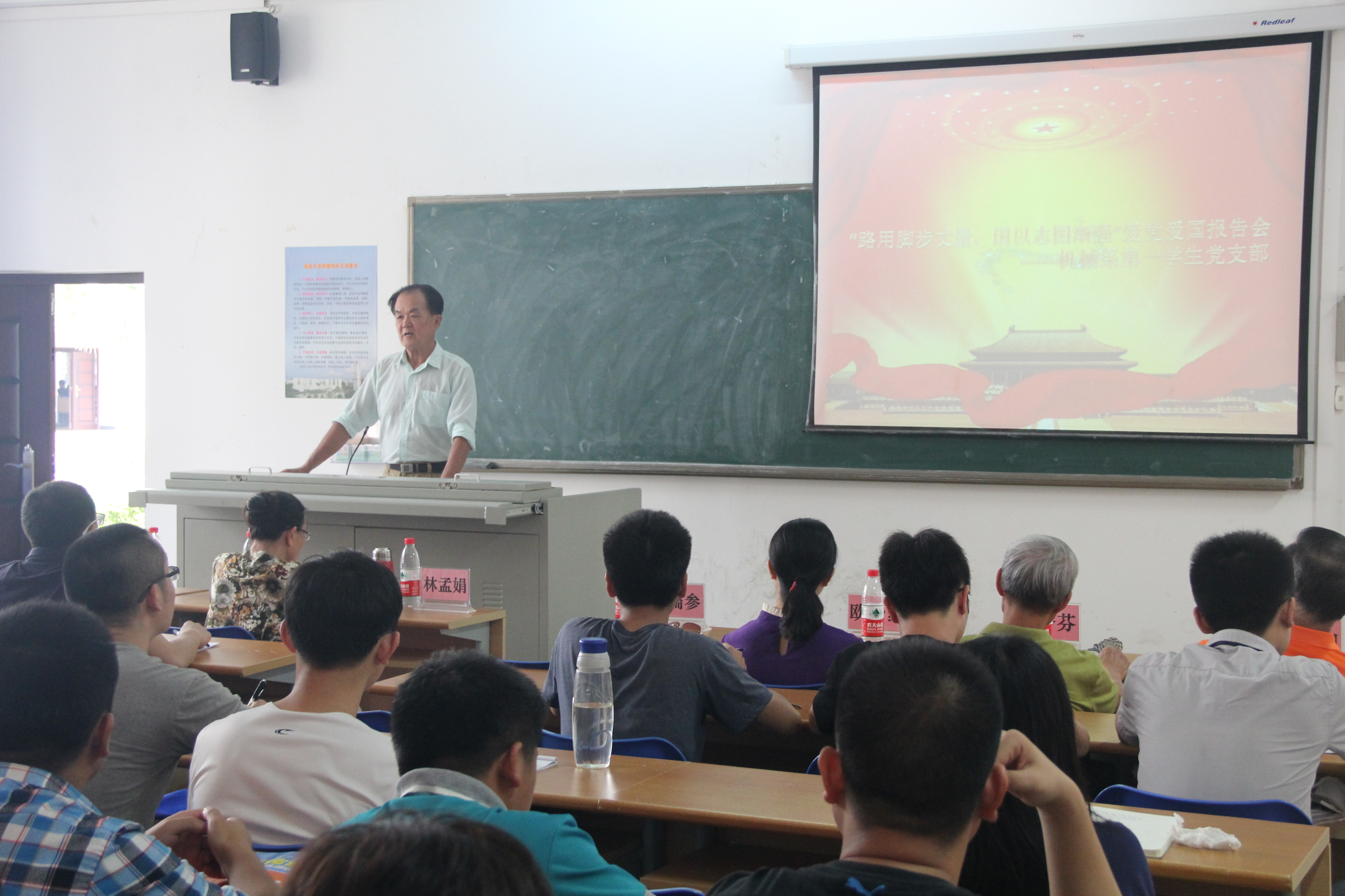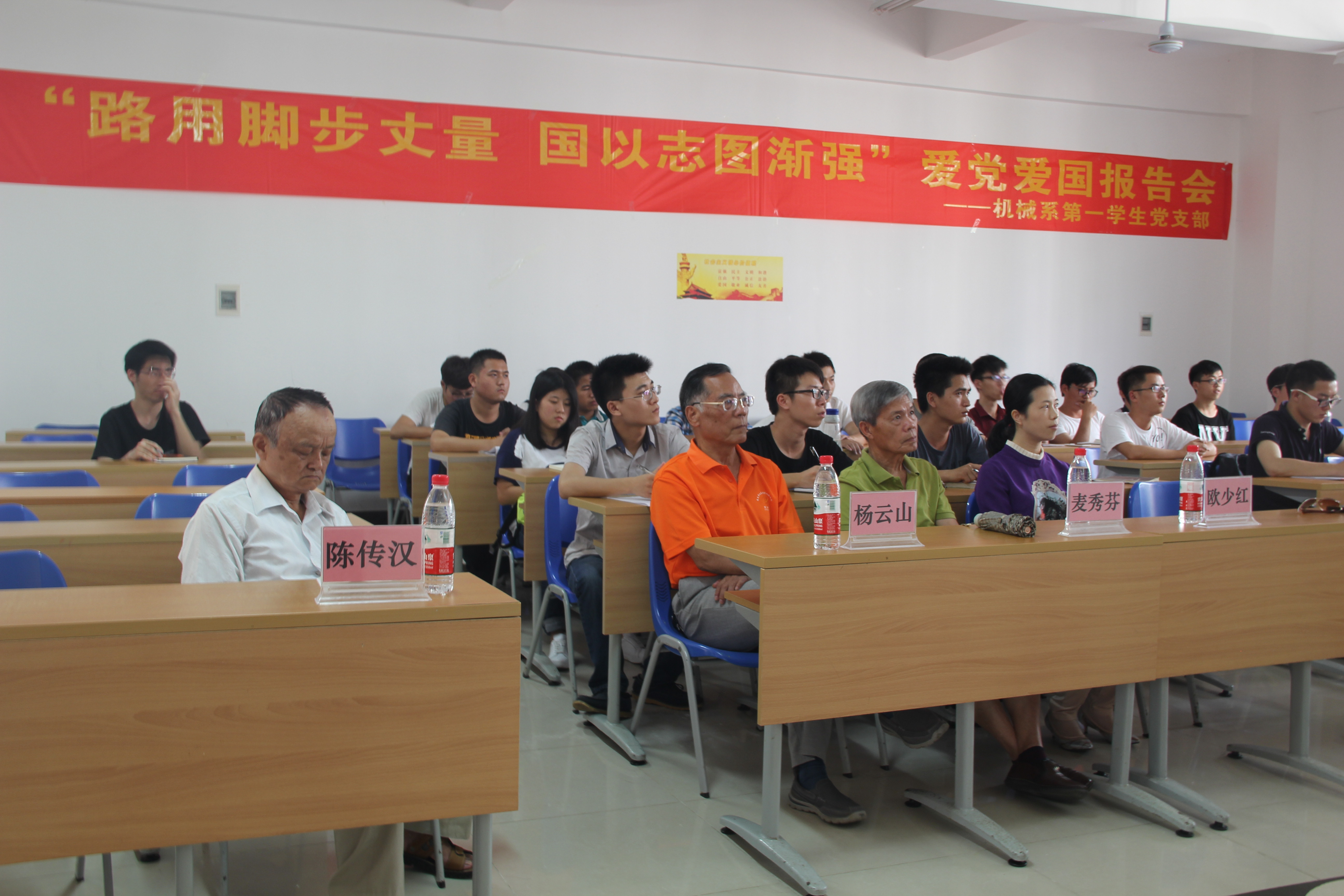 为了积极响应党中央“学党章党规、学系列讲话,做合格党员”的“两学一做”学习教育号召,加强员工党员的党性修养建设。欢迎来公海欢迎来到赌船机械系第一员工党支部于四月十五日下午在4-109隆重举行主题为“路用脚步丈量,国以志图渐强”的爱党爱国报告会,出席报告会的有欢迎来到公海7108线路关工委、党史国史宣讲团成员程儒参、杨云山、陈传汉、麦秀芬、林孟娟老师,公司党委李宏副书记,信息科学与技术公司党委会秘书欧少红,机械系第一员工党支部书记崔建兵,参支部党员、入党积极分子约40人参加本次活动。报告会由宣传委员金杯主持。